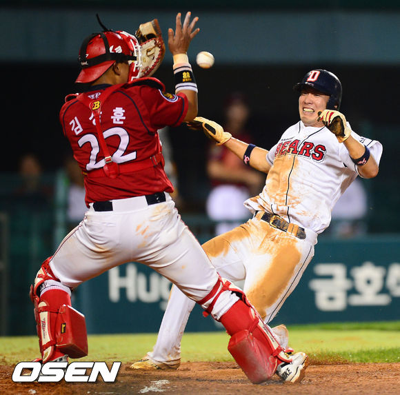 13일 오후 서울 잠실구장에서 열린 2013 한국야쿠르트 세븐프로야구 두산 베어스와 KIA 타이거즈의 경기, 6회말 2사 주자 2루 두산 민병헌의 중견수 앞 1루타때 김재호가 홈으로 쇄도하고 있다.