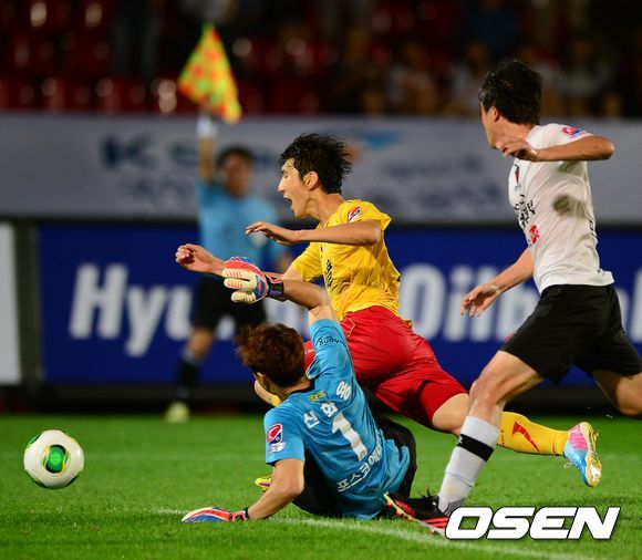 후반 성남 김동섭이 포항 신화섭 골키퍼에 걸려 넘어지고 있다. 하지만 파울에 앞서 오프사이프 선언.