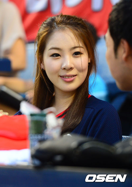 13일 오후 서울 잠실구장에서 열린 2013 한국야쿠르트 세븐프로야구 두산 베어스와 KIA 타이거즈의 경기, 전 체조선수이자 두산에서의 백일루션 시구로 유명한 신수지가 관중석에서 미소짓고 있다.