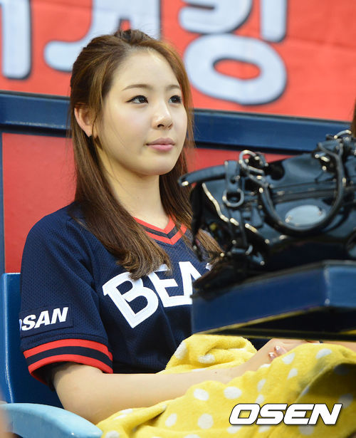 13일 오후 서울 잠실구장에서 열린 2013 한국야쿠르트 세븐프로야구 두산 베어스와 KIA 타이거즈의 경기, 전 체조선수이자 두산에서의 백일루션 시구로 유명한 신수지가 관중석에서 두산을 응원하고 있다.