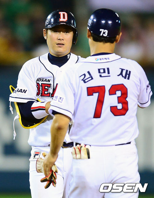 13일 오후 서울 잠실구장에서 열린 2013 한국야쿠르트 세븐프로야구 두산 베어스와 KIA 타이거즈의 경기, 7회말 2사 주자 1,2루 두산 이원석이 좌중간 2타점 적시타를 날린 후 2루에서 김민재코치와 하이파이브를 하고 있다.