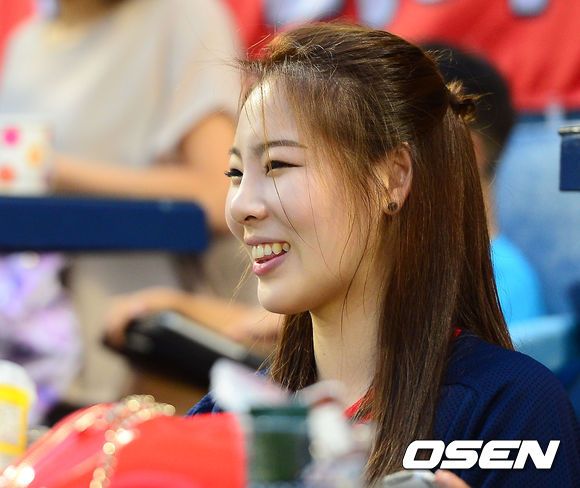 13일 오후 서울 잠실구장에서 열린 2013 한국야쿠르트 세븐프로야구 두산 베어스와 KIA 타이거즈의 경기, 전 체조선수이자 두산에서의 백일루션 시구로 유명한 신수지가 관중석에서 두산을 응원하며 미소짓고 있다.
