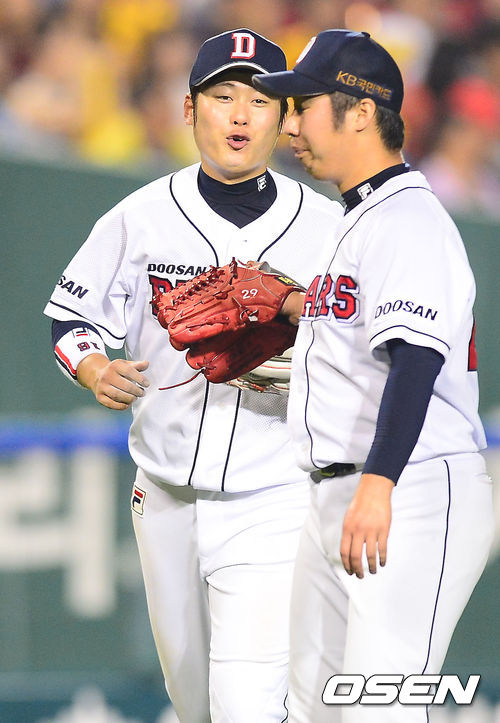 13일 오후 서울 잠실구장에서 열린 2013 한국야쿠르트 세븐프로야구 두산 베어스와 KIA 타이거즈의 경기, 8회초를 마친 후 이원석과 유희관이 하이파이브를 하고 있다.
