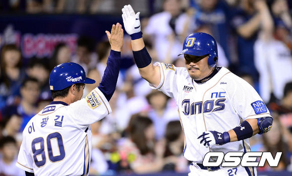 13일 오후 창원 마산구장에서 열린 '2013 한국야쿠르트 세븐 프로야구' NC 다이노스와 롯데 자이언츠의 경기, 7회말 무사 NC 이호준이 롯데 김승회를 상대로 솔로 홈런을 때린 뒤 3루 이광길 코치와 하이파이브를 하고 있다.