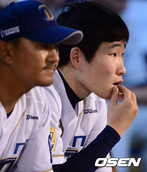13일 오후 창원 마산구장에서 열린 '2013 한국야쿠르트 세븐 프로야구' NC 다이노스와 롯데 자이언츠의 경기, 8회말 2사 NC 이재학이 더그아웃에 앉아 경기를 관전하고 있다.