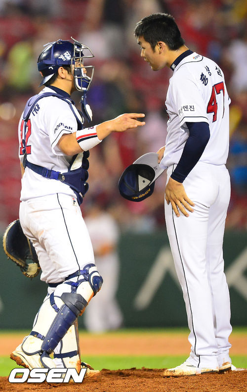 경기를 마치고 두산 최재훈과 홍상삼이 하이파이브를 하고 있다. / rumi@osen.co.kr