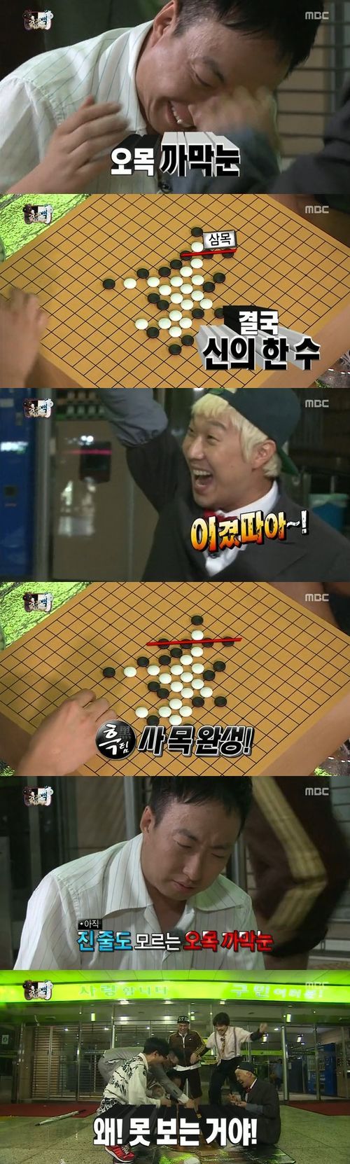 그러나 백팀은 ‘오목’ 게임으로 뒤집기를 제안했고 흑팀이 이를 받아들여 하하와 박명수가 오목 게임에 참여했다. 박명수는 오목을 잘 할 수 있다며 자신감을 내비쳤지만 게임이 시작되자 박명수는 하하의 수비에 어쩔 줄 몰라 했다.