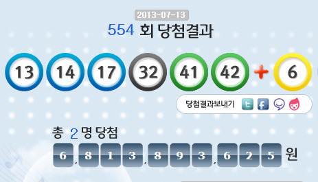 [OSEN=이슈팀] 로또554회당첨번호가 발표됐다. 이번 주 행운의 번호는 13, 14, 17, 32, 41, 42이고 보너스번호는 6이다. 로또554회당첨번호는 나눔로또 홈페이지에 매주 복권 추첨후 게재된다.