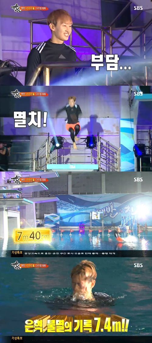 이날 대결 방식은 3m 플랫폼에서 멀리뛰기로 진행됐다. 아이돌과 '맨친'의 숨 막히는 대결이 펼쳐지는 가운데 '맨친'의 에이스 은혁이 다이빙에 나섰다.