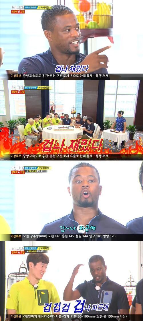 [OSEN=이슈팀] 박지성(32, 퀸스파크 레인저스)의 '절친‘ 파트리스 에브라(32, 맨체스터 유나이티드)가 뛰어난 축구 실력 못지 않는 예능감을 맘껏 뽐냈다. 에브라는 만만치 않은 눈치와 게임 실력, 그리고 우리말까지 재미있게 구사해 놀라게 했다.14일 방송된 SBS '일요일이 좋다-런닝맨'(이하 럴닝맨)에서는 '런닝맨' 멤버들과 박지성이 2013 아시안 드림컵에 출전하기 위해 개최지인 상하이에서 최후의 미션 대결을 펼치는 내용이 전파를 탔다. 에브라도 박지성을 돕기 위해 장거리 비행을 마다하지 않고 달려왔고 방송에도 출연해 예능감을 발휘했다.