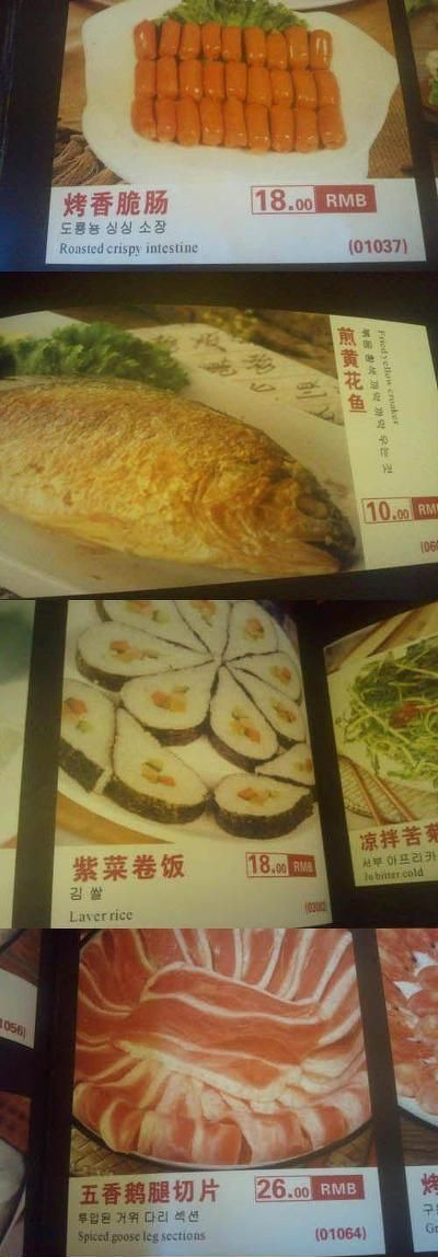 예를 들면, 중국 식당의 한국 음식 메뉴로는 도룡뇽 싱싱 소장을 비롯해 김쌀(김밥), 투입된 거위 다리 섹션(거위 샤브샤브), 치킨 모래주머니(닭똥집), 생선구이 말의 얼굴, 좋아요 구분 돼지 전채 등이다.