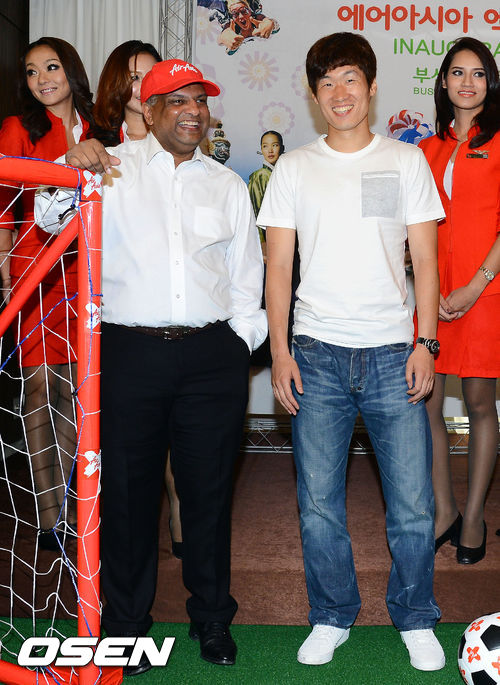 15일 오전 부산 해운대 파라다이스 호텔에서 진행된 에어아시아 엑스 '부산-쿠알라룸푸르 노선 취항 기자간담회'에서 퀸즈파크레인저스(QPR)의 구단주인 토니 페르난데스 에어아시아 회장과 박지성이 미소짓고 있다.