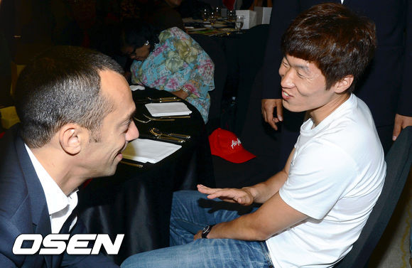 15일 오전 부산 해운대 파라다이스 호텔에서 진행된 에어아시아 엑스 '부산-쿠알라룸푸르 노선 취항 기자간담회'에서 박지성이 관계자와 이야기를 나누고 있다.