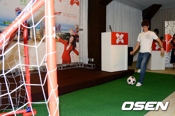 15일 오전 부산 해운대 파라다이스 호텔에서 진행된 에어아시아 엑스 '부산-쿠알라룸푸르 노선 취항 기자간담회'에서 박지성이 이벤트에 참여하고 있다.