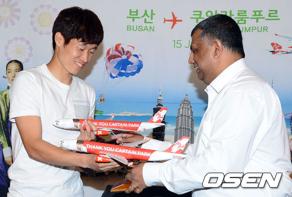 15일 오전 부산 해운대 파라다이스 호텔에서 진행된 에어아시아 엑스 '부산-쿠알라룸푸르 노선 취항 기자간담회'에서 박지성이 퀸즈파크레인저스(QPR)의 구단주인 토니 페르난데스 에어아시아 회장과 각자 사인이 담긴 미니 모형 비행기를 주고 받고 있다.
