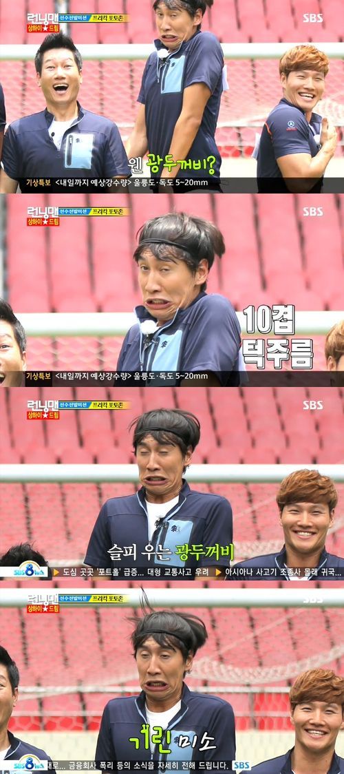 이광수는 계속되는 프리킥 포토존에서 웃지 못하고 얼굴을 찡그리는 바람에 10겹 턱주름이 생겨 ‘광두꺼비’라는 별명까지 얻었다. 결국 이광수는 “나 원래 저렇게 웃는다”며 해명했지만 미션 실패로 또 도전해야 했다.
