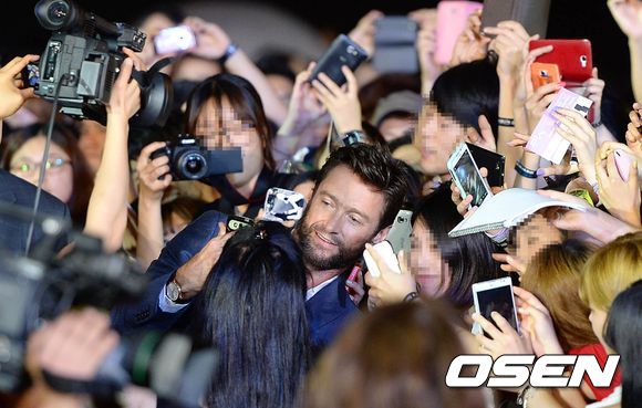 할리우드 배우 휴 잭맨이 팬들과 사진 촬영을 하고 있다.