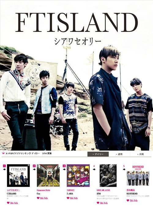 일본 최대 음원 사이트인 레코초쿠에 따르면 24일 발매를 앞둔 FT아일랜드 신곡 ‘시아와세오리’가 K-POP 아시아 데일리 차트 1위에 올랐다.