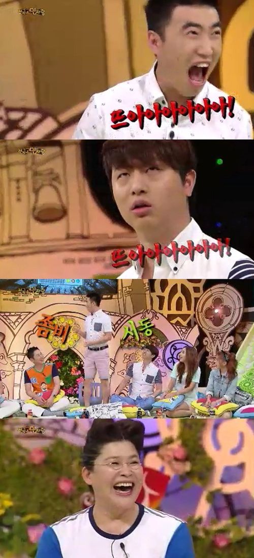 장동민과 유상무의 좀비 변신에 MC 이영자는 "역시 최고다"라고 극찬해 눈길을 끌었다.