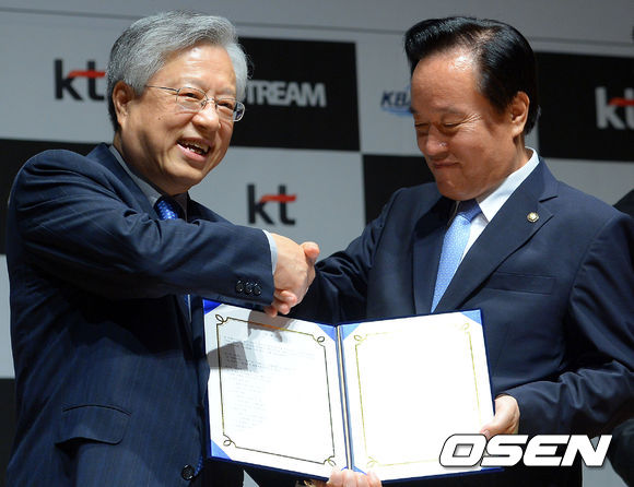 16일 오후 서울 KT 광화문사옥 올레스퀘어에서 진행된 한국 야구 발전과 아마추어 야구 활성화를 위한 업무협약(MOU) 체결식에서 KT 이석채 회장과 대한야구협회 이병석 회장이 악수를 나누고 있다.