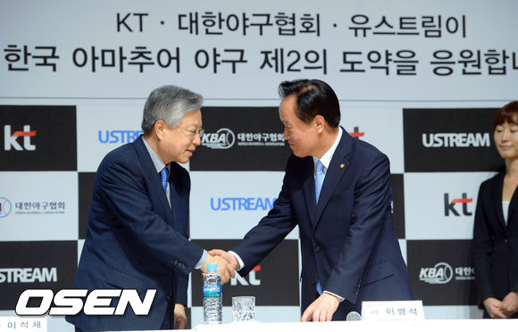 16일 오후 서울 KT 광화문사옥 올레스퀘어에서 진행된 한국 야구 발전과 아마추어 야구 활성화를 위한 업무협약(MOU) 체결식에서 KT 이석채 회장과 대한야구협회 이병석 회장이 악수를 나누고 있다.