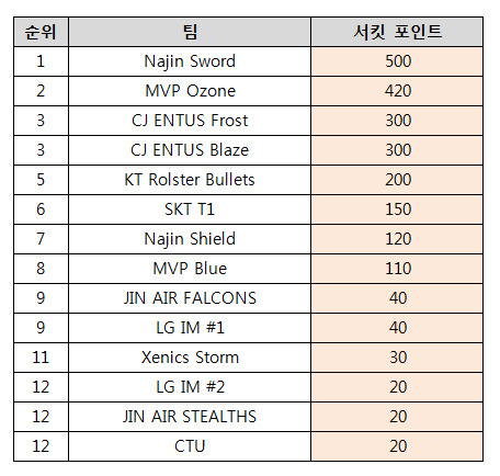 나진 소드의 뒤를 이어 스프링 시즌 우승팀인 MVP 오존(420점), CJ 프로스트(300점), CJ 블레이즈(300점) KT 불리츠(200점) SK텔레콤 T1(150점) 나이트 화이트 실드(120점)가 유력한 후보다.
