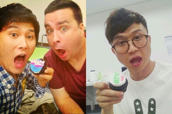 사진 속 샘과 변기수는 입을 크게 벌리며 케이크를 먹는 포즈를 취하고 있으며, 컵케이크 위에는 '어럽쇼 변'이라고 쓰여 있어 변기수를 위한 맞춤 케이크라는 것을 짐작케 한다.