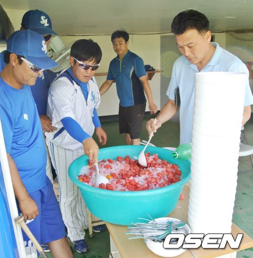 김정수 삼성 1군 매니저는 16일 훈련을 앞두고 수박 화채를 마련했다. 코칭스태프, 선수단, 지원 요원 등 50여 명이 마음껏 먹을 수 있도록 푸짐하게 준비했다. '게 눈 감추듯' 순식간에 사라졌다. 그야말로 인기 폭발이었다.