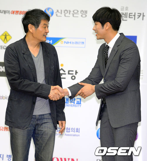16일 오후 서울 충무로 신세계백화점 본점 문화홀에서 진행된 제9회 제천국제음악영화제 공식 기자회견에서 홍보대사로 위촉된 2AM 임슬옹이 허진호 집행위원장과 악수를 나누고 있다