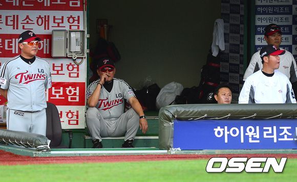 16일 오후 부산 사직구장에서 '2013 한국야쿠르트 세븐 프로야구' 롯데 자이언츠 대 LG 트윈스의 경기가 열렸다. LG 김기태 감독이 계단에 걸터앉아 경기를 지켜보고 있다.