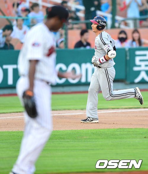 16일 오후 부산 사직구장에서 '2013 한국야쿠르트 세븐 프로야구' 롯데 자이언츠 대 LG 트윈스의 경기가 열렸다. 4회초 LG 공격 선두타자로 나선 2번 손주인이 선제 좌월 솔로포를 날리고 그라운드를 돌고 있다.
