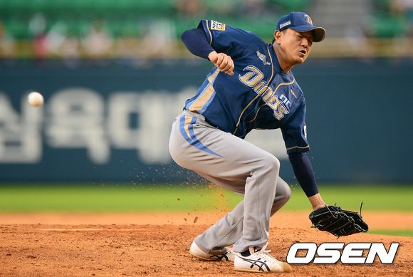 16일 오후 서울 잠실야구장에서 열린 '2013 한국야쿠르트 세븐 프로야구' 두산 베어스와 NC 다이노스의 경기, 2회말 2사 1,2루에서 NC 손민한이 두산 김재호의 역전 적시타를 허용하고 있다.