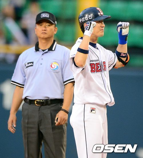 16일 오후 서울 잠실야구장에서 열린 '2013 한국야쿠르트 세븐 프로야구' 두산 베어스와 NC 다이노스의 경기, 2회말 2사 1,2루에서 두산 김재호가 역전 적시타를 날리고 기뻐하고 있다.