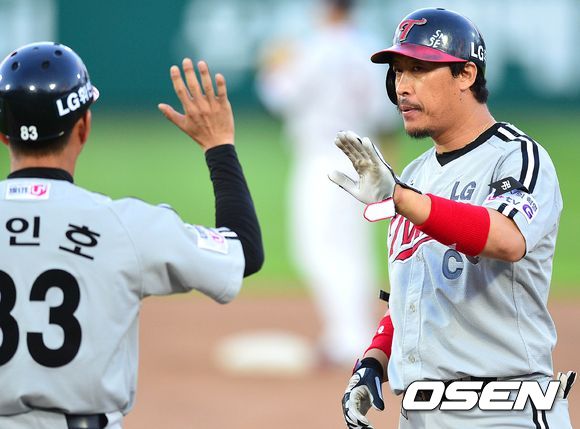 16일 오후 부산 사직구장에서 '2013 한국야쿠르트 세븐 프로야구' 롯데 자이언츠 대 LG 트윈스의 경기가 열렸다. 4회초 LG 공격 1사 2루 상황 5번타자 이병규가 1타점 적시 좌전안타를 날리고 김인호 1루코치와 인사를 나누고 있다.