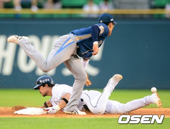 16일 오후 서울 잠실야구장에서 열린 '2013 한국야쿠르트 세븐 프로야구' 두산 베어스와 NC 다이노스의 경기, 2회말 2사 1루에서 두산 오재원이 2루 도루에 성공하고 있다.