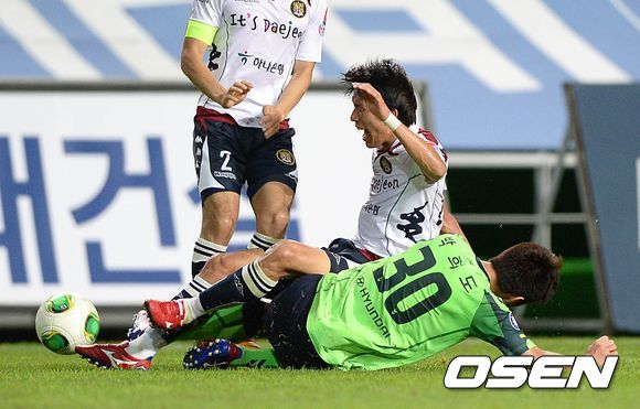 후반 대전 허범산이 전북 이희도의 태클에 걸려 넘어지고 있다. /sunday@osen.co.kr