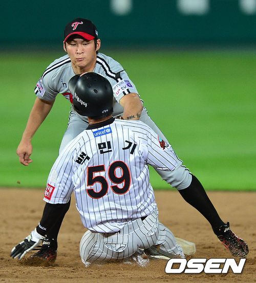 16일 오후 부산 사직구장에서 '2013 한국야쿠르트 세븐 프로야구' 롯데 자이언츠 대 LG 트윈스의 경기가 열렸다. 9회말 롯데 공격 2사 1루 상황 1루 주자 백민기가 LG투수 봉중근의 견제 때 2루로 내달리다 유격수 오지환의 태그에 걸려 아웃되고 있다.