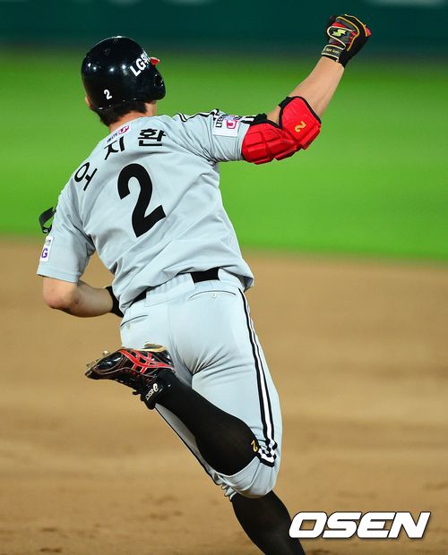 16일 오후 부산 사직구장에서 '2013 한국야쿠르트 세븐 프로야구' 롯데 자이언츠 대 LG 트윈스의 경기가 열렸다. 연장 11회초 LG 공격 2사 2루 상황 9번타자 오지환이 우중월 투런포를 날리고 주먹을 불끈 쥐며 그라운드를 돌고 있다.