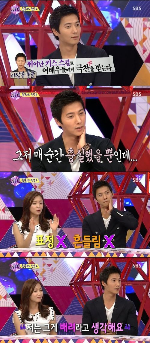 남상미는 “특이했던 게 보통 키스신을 하면 부끄러워하거나 겸연쩍어 하는데 이상우는 포커페이스다”며 “정말 표정도 없고 흔들림도 없이 슛 들어가면 정말 기계처럼 한다”고 밝혔다. 이에 MC 신동엽은 “키스머신이냐”며 깜짝 놀라했다.