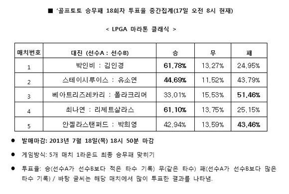 선수B 지정된 김인경의 우세를 전망한 참가자는 24.95%로 집계됐고, 나머지 13.27%는 양 선수가 같은 타수대를 기록할 것으로 예상했다.