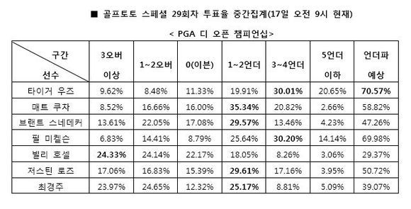 지정 선수별 1라운드 예상 스코어에서는 타이거 우즈(30.01%)와 필 미켈슨(30.20%)은 3~4언더파 예상을, 매트 쿠차(35.34%), 브랜트 스네데커(29.57%), 저스틴 로즈(29.61%), 최경주(25.17%)은 1~2언더파를 기록할 것이란 예상이 높게 집계됐다. 반면 빌리 호셀(24.33%)은 3오버 이상을 기록할 것으로 예측됐다.