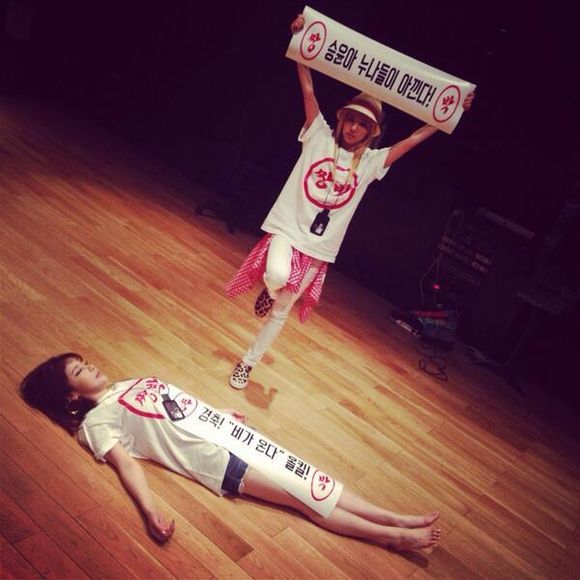 공개된 사진에는 '승윤아 누나들이 아낀다!'라는 문구가 적힌 플래카드를 든 산다라박과 '경축! "비가 온다" 올킬!'이라는 문구의 플래카드를 이불처럼 덮고 있는 박봄의 모습이 담겨있다. 특히 '쌍박' 티셔츠를 맞춰 입은 두 사람은 코믹한 포즈와 표정으로 강승윤을 향한 응원 메시지를 전하고 있어 눈길을 끈다.