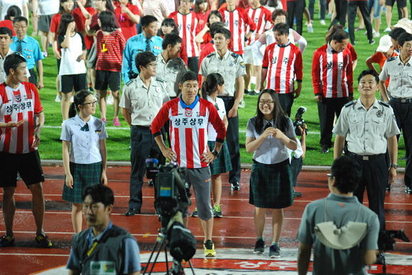 상주 상무축구단이 일석이조의 효과를 챙겼다. 상무는 지난 7일 상주시민운동장에서 열린 현대오일뱅크 K리그 챌린지 16라운드에서 부천FC에게 짜릿한 2-0 승리를 챙겼다. 경기 후 선수들과 관중들이 어울려 학교폭력예방을 기원하는 대규모 플래시몹 행사를 열었다.