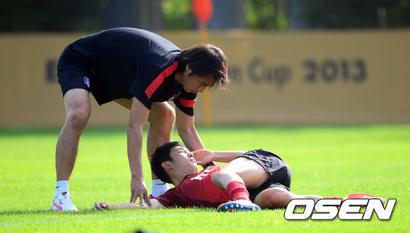 17일 오후 경기도 파주 국가대표 축구 트레이닝 센터(NFC)에서 열린 축구 대표팀 공개훈련에서 홍명보 감독이 이승기의 스트레칭을 도와주고 있다.