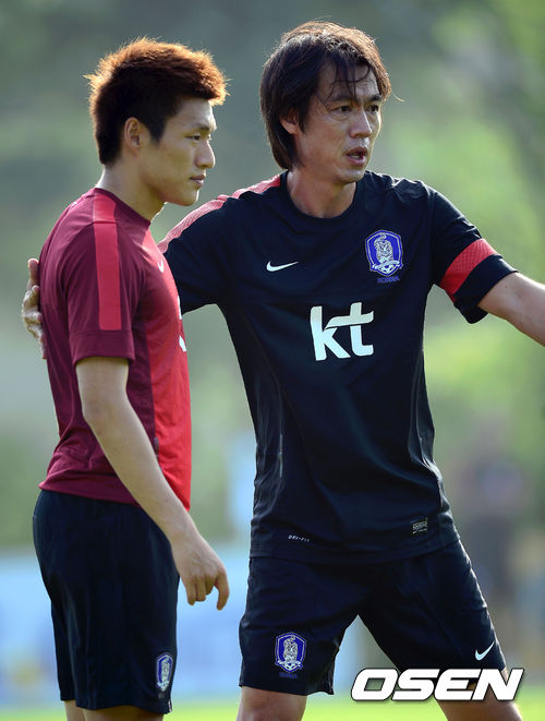 17일 오후 경기도 파주 국가대표 축구 트레이닝 센터(NFC)에서 열린 축구 대표팀 공개훈련에서 홍명보 감독이 이명주에게 전술을 설명하고 있다.