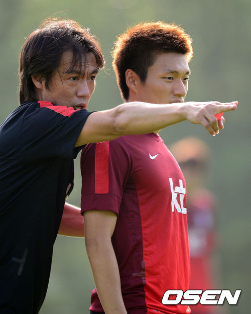 17일 오후 경기도 파주 국가대표 축구 트레이닝 센터(NFC)에서 열린 축구 대표팀 공개훈련에서 홍명보 감독이 이명주에게 전술을 설명하고 있다.