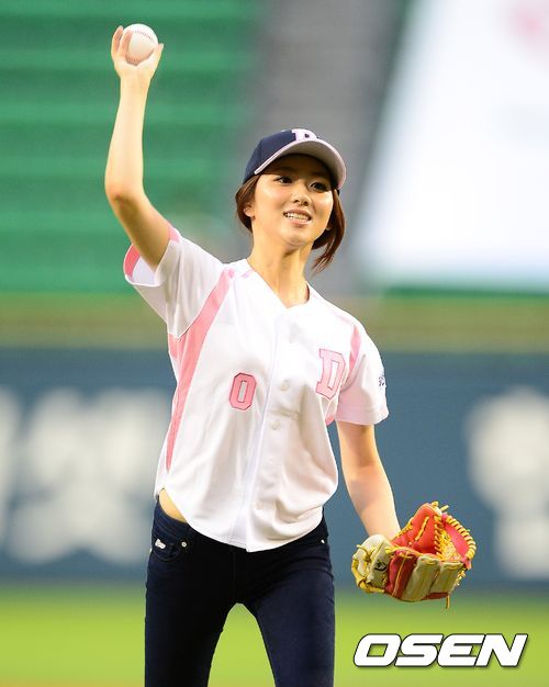 17일 오후 서울 잠실야구장에서 열린 '2013 한국야쿠르트 세븐 프로야구' 두산 베어스와 NC 다이노스의 경기, 경기에 앞서 XTM 조유영 아나운서가 시구를 하고 있다.