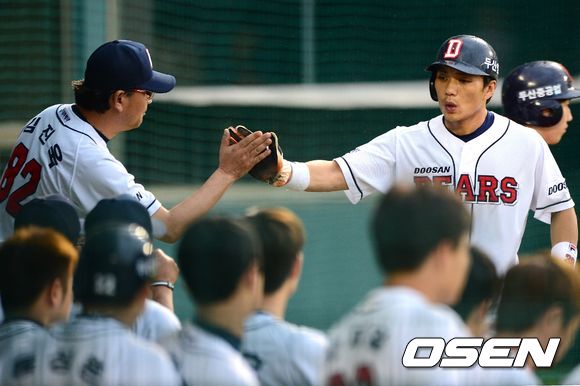 17일 오후 서울 잠실야구장에서 열린 '2013 한국야쿠르트 세븐 프로야구' 두산 베어스와 NC 다이노스의 경기, 1회말 무사 2,3루에서 김현수의 우익수 외야플라이에 3루주자 이종욱이 태그업, 득점에 성공하고 더그아웃에서 김진욱 감독과 하이파이브를 하고 있다.