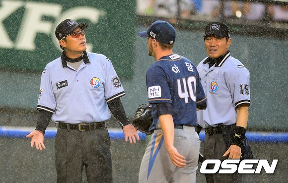 17일 오후 서울 잠실야구장에서 열린 '2013 한국야쿠르트 세븐 프로야구' 두산 베어스와 NC 다이노스의 경기, 1회말 우천으로 경기를 중단시키며 NC 아담이 더그아웃으로 향하고 있다.