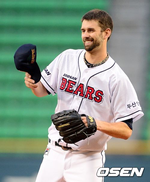 17일 오후 서울 잠실야구장에서 열린 '2013 한국야쿠르트 세븐 프로야구' 두산 베어스와 NC 다이노스의 경기, 경기에 앞서 두산 선발 니퍼트가 연습투구를 하며 미소짓고 있다.